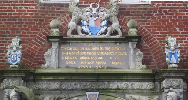 Jørgen Skeel til Sostrup ridder. Fr. Jytte Brock. Anno 1617”.